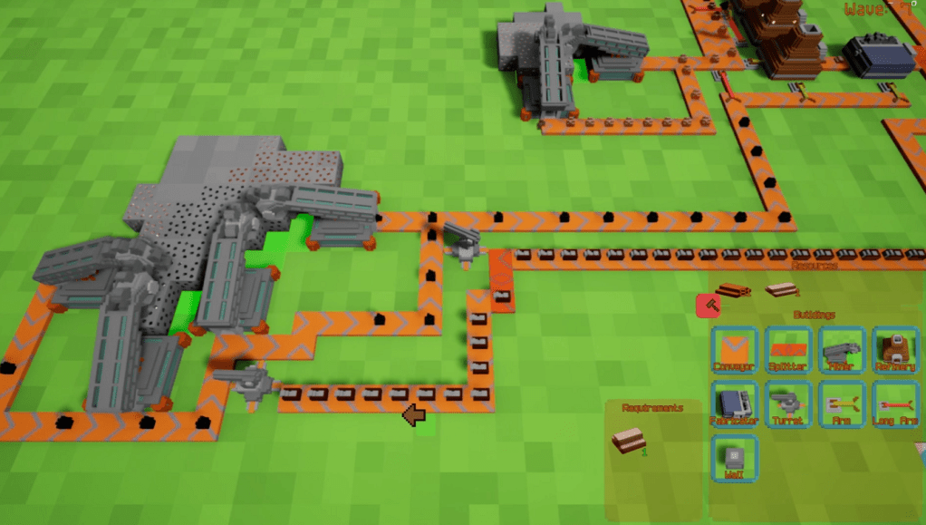 This is Factory Defender, My final year project at Staffordshire University. It’s a base-building and tower-defence game, with the goal of surviving for as long as possible by building a factory. The main fabrication loop consisted of mining resources, smelting into ingots, purchasing more buildings with those ingots and crafting ammunition to fight back against the oncoming waves of enemies.